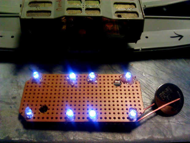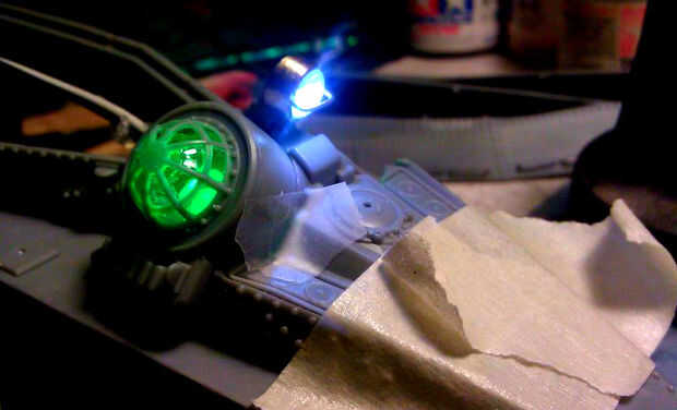 Se debe probar como va, tanto para el ajuste, la función y la luz se filtra. Mantenga la mano para probar la función de una batería de litio o el pack de baterías elegido. Prueba también el ajuste, no sólo de los LEDs y cableado, pero las piezas del modelo. Si las piezas no encajan perfectamente, tienes fugas de luz en las costuras. Si usted no puede hacer una parte ajuste apretado lo suficiente como para bloquear la luz, puede ser puttied y lijar o utilizar uno de mis trucos favoritos: mezclar un pequeño lote de 5 minutos y luego mezcla en algunos pintura acrílica negra para hacer opaco el epoxi. Este trabajo en la costura, luego limpie el exceso con un paño humedecido con alcohol isopropílico. Ni el alcohol ni el de epoxy se daña el plástico, como bajar el exceso antes.