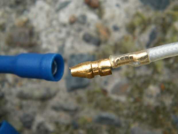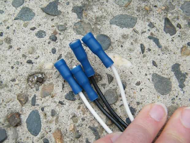 corté el alambre tenía longitudes iguales de cada color para ambas luces. Para mantener las cosas ordenadas me atados ambos conjuntos de alambre cerca del extremo de la batería y los de la bobina por separado. Usando el conector hembra que se aparearon con los conectores macho en las luces, había despojado de los extremos del alambre y había prensado de los conectores en. Utilicé estos conectores para pude desconectarlos fácilmente. Podría tener cableado pero desean mantener cosas portable y fácilmente almacenados.