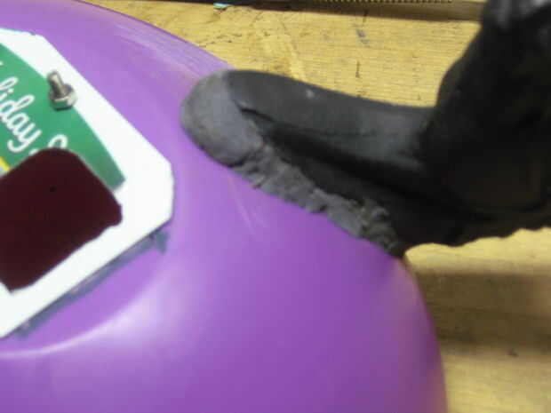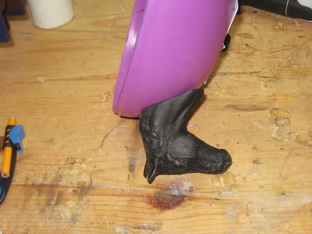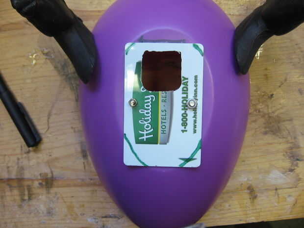 Ahora determine dónde desea las piernas que. Lo hice sosteniendo la parte inferior del huevo en el ángulo que quería sentarse y después colocando una de las patas para que sostendría el cuerpo en esta posición. Una vez pensé que podría funcionar coloreado alrededor del agujero del tornillo en la parte posterior del caballo. Con el marcador aplicado me pone la pierna en posición otra vez y presiona firmemente. Esta izquierda una marca para poder perforar en.