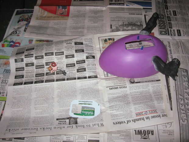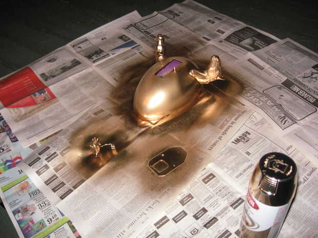 Ahora coloque el huevo, el pescado rey y lámpara en periódico y les pintura de aerosol. Elegí un buen oro llamativo. Puede que necesite varias capas para suprimir el color original de los materiales y conseguir cobertura uniforme.