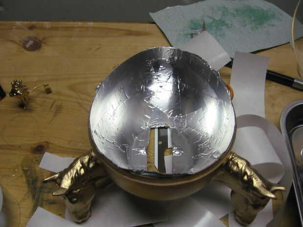 Una vez que has pintado el exterior del huevo que falta terminar el interior del huevo. Necesitamos que la luz es dirigida a través del vidrio y no brilla a través del cuerpo del huevo. Para ello que vamos a cubrir la superficie interna del huevo con la cinta de reparación de ductos de metal. Esto es de aluminio con un adhesivo en la parte posterior, no su cinta para ductos gris estándar. Puesto que es metal es muy brillante. Usted sólo pela el forro y pegarlo en. Utilizado tijeras y un cuchillo para cortar el exceso fuera de los bordes.