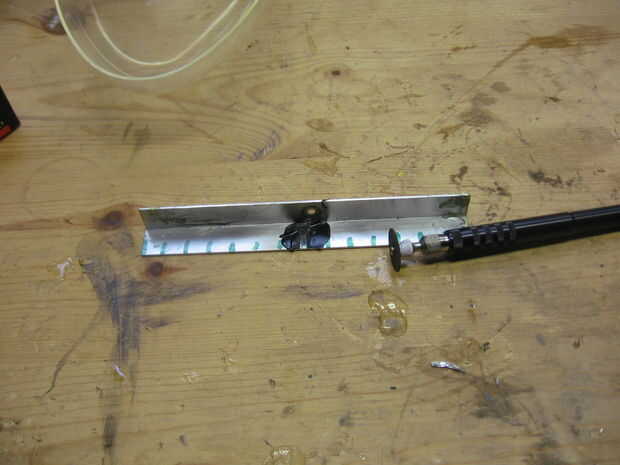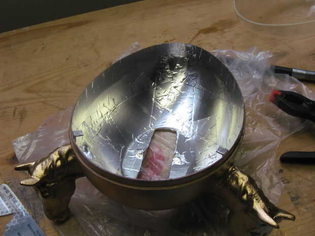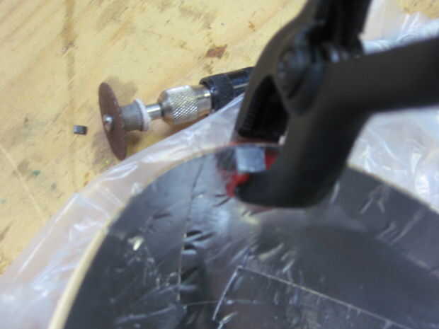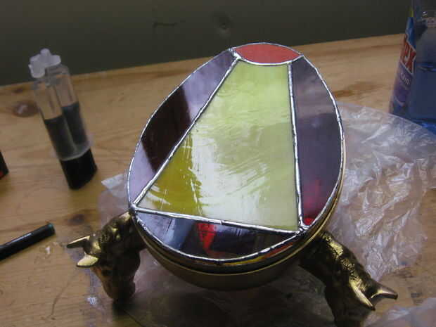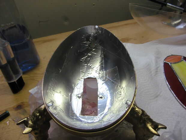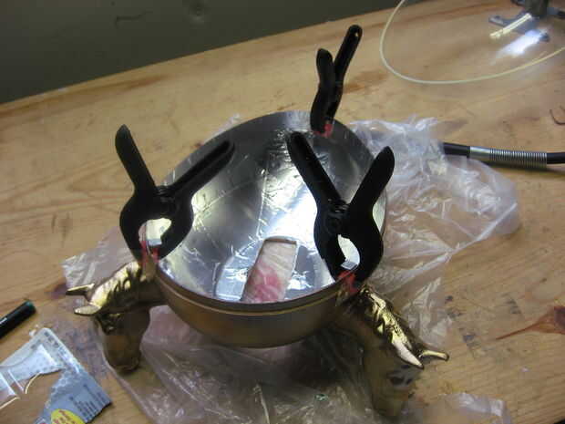Primero apuntale el huevo para que quede nivelado. Después de epoxy en una pierna del soporte L y sujete en su lugar. La superficie de la pierna no ajustaron del soporte L debe estar nivelado con o un poco por encima de la parte superior del cuerpo de huevo. Repita con los otros dos soportes. (Si Envuelva cinta alrededor de las abrazaderas del embalaje el epoxi no se unen a ellos.) Usted querrá probar y coloque los soportes de tal manera que están detrás de las líneas de soldadura de vidrio o en otros lugares poco visibles.
