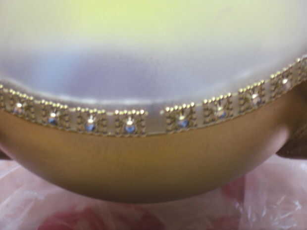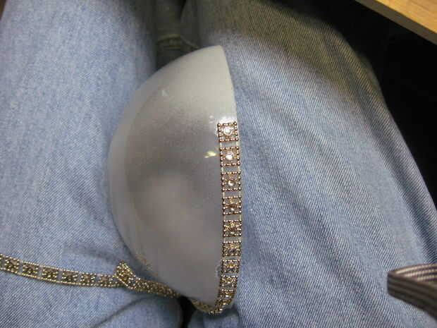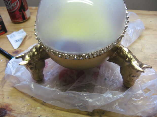 Luego camufla la marca corte pegando bling alrededor del perímetro. Usé pegamento para fijar un extremo de lo bling y luego encolar sobre cada pieza Quinta todo el perímetro de la mitad superior. Que tenga pegamento más piezas en la curva más estrecha del extremo estrecho del huevo. También me aseguré de pegar las piezas a cada lado del hueco que corte para acomodar el vidrio.