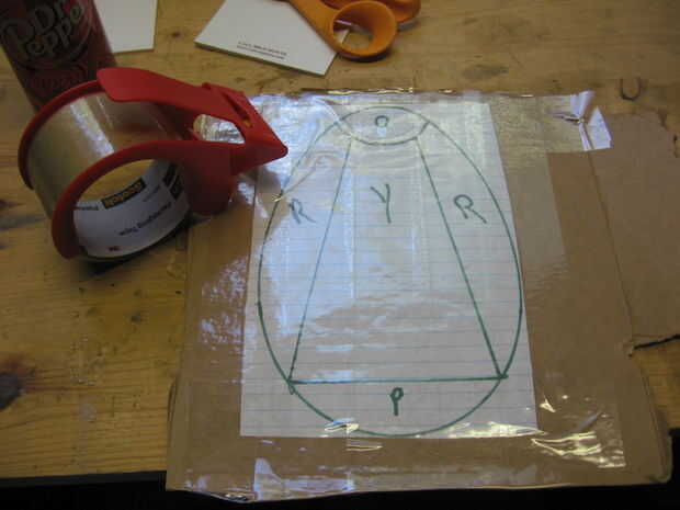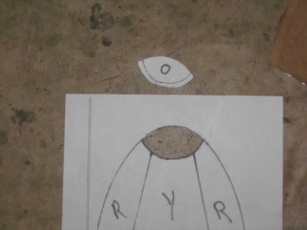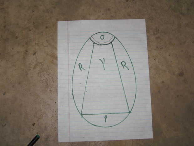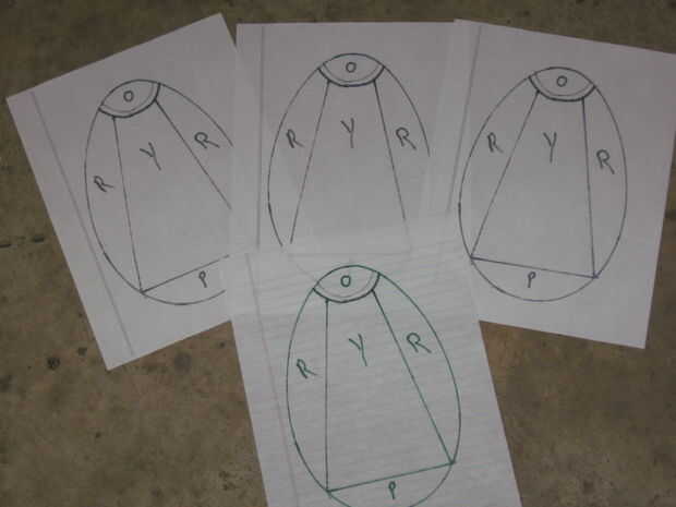 Me puso la parte inferior de la mitad de mi huevo en un pedazo de papel y trazada alrededor del perímetro. Entonces yo saqué un patrón geométrico simple dentro del contorno. Fui con un sol brillando hacia abajo sobre el tipo de agua de adorno. No estoy seguro por que tuve colores trabajó con. Luego había marcado cada forma con la primera letra del color deseado. Luego hice varias copias. Esto es así podría cortar las piezas individuales para trazar en el vidrio. Cuando usted corta las piezas que desea ser justo dentro de la línea. Esto compensará el ancho de la soldadura cuando se ensamblan las piezas.
