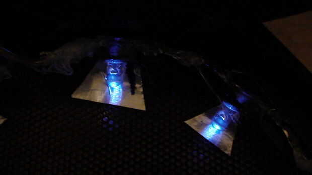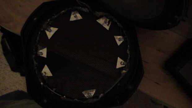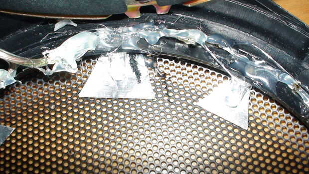 Empecé quitando la tapa y determinar donde podría caber un LED luego perforó un agujero en la parte de plástico del marco no la malla y tiró de los cables del LED a través de por lo que señalaron en la malla del hablante, entonces tomó un pequeño trozo de papel de aluminio y cortar en un triángulo y se deslizó bajo el LED y luego tomar la pistola encoladora y Aplique pegamento en el agujero para el LED hasta un poco obtiene en la hoja para mantener en su lugar y luego pegar en la parte superior del LED para sujetarlo firmemente. Finalmente debe ejecutar hilos finos alrededor de la parte de afuera de la cubierta del altavoz manteniendo los LEDs en serie. (Por esta razón sólo pones 74 agujeros en la caja de 8 LEDs IR en cada altavoz a la luz abundante, si tu no poner cualquier LED en los altavoces entonces sencillamente el resto en la caja de un total de 85 ~ 90 LEDs o si puede poner LEDs en más de los altavoces y sólo asegúrese de que total 85 ~ 90 LEDs. También asegúrese de cubrir las conexiones expuestas con pegamento caliente en la cubierta del altavoz por lo que no corta con el marco del altavoz, entonces tampoco agoten los cables un agujero en el marco del altavoz (si existe) o taladre un orificio en el plástico que cubre el altavoz sí no los altavoces.