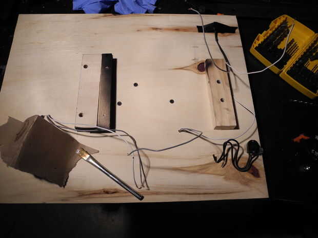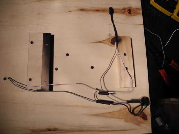 He construido un sencillo circuito con el interruptor y un enchufe de alimentación. Colocar todo abajo con epoxi. La próxima vez que hago esto podría construir un mejor sistema de autónomos en lugar de simplemente pegar hasta la parte posterior.