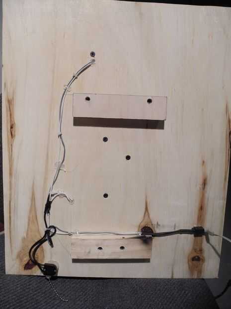 Para colgar la pieza terminada en la pared y darle suficiente espacio para el cableado usé una cala francés hecho en madera contrachapada de 1/2" con un bloque en la parte inferior para estabilizarlo.