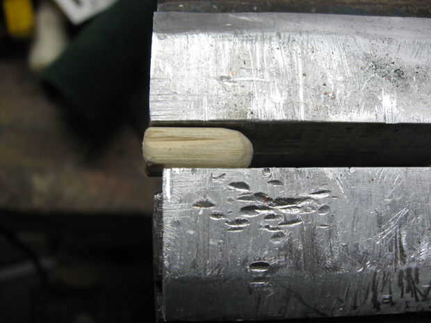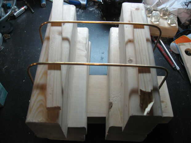 Las barras están alineadas entonces usando bloques de madera para asegurar su altura uniforme. Una vez que se colocan correctamente se pegan en su lugar con pegamento y a la izquierda para secar.