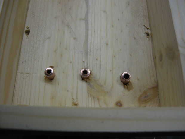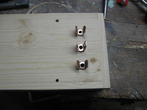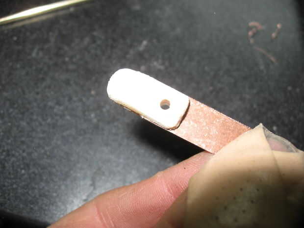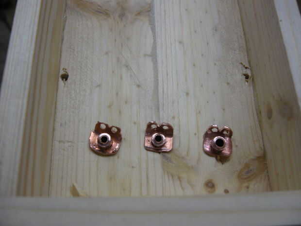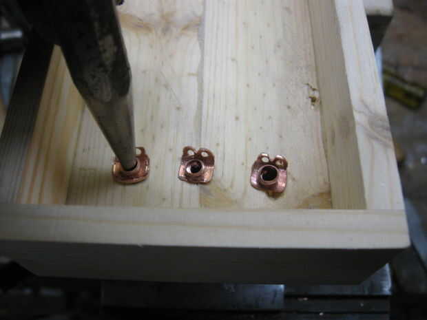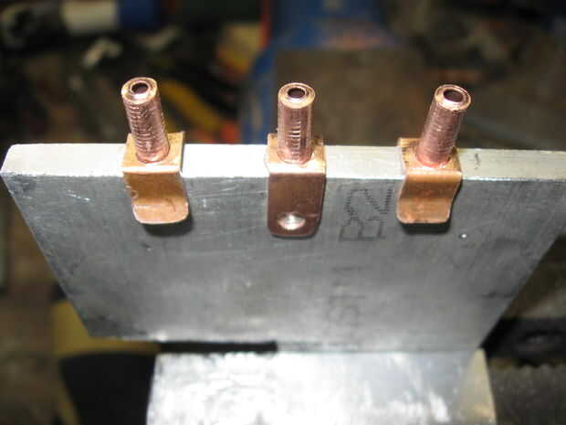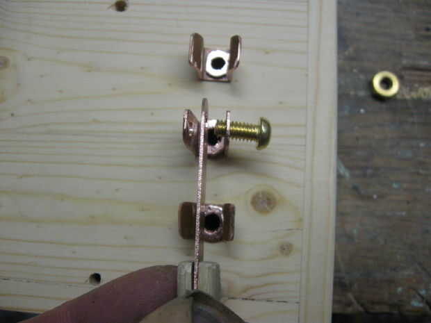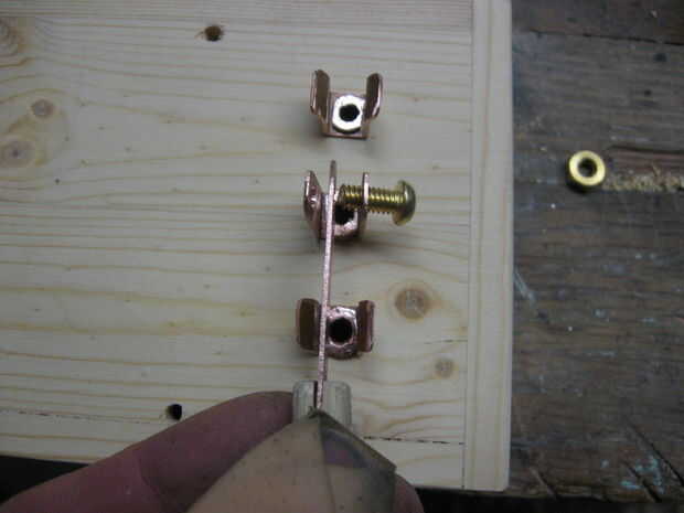 La varilla de latón se presiona sobre los agujeros en la base de un alambre se une a cada uno usando una pistola de soldar y soldadura estándar. Esto hace las barras una barra de distribución.