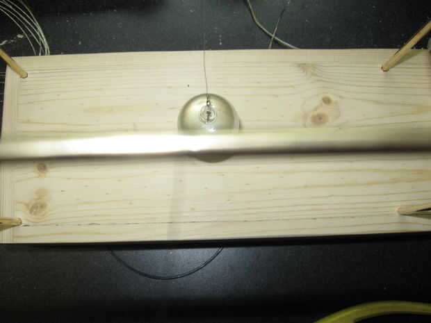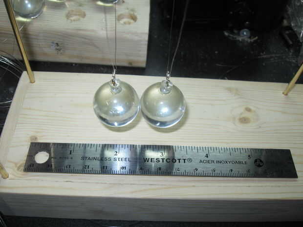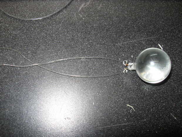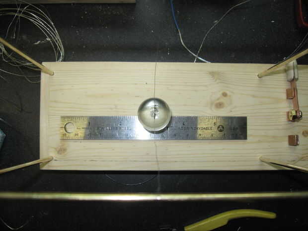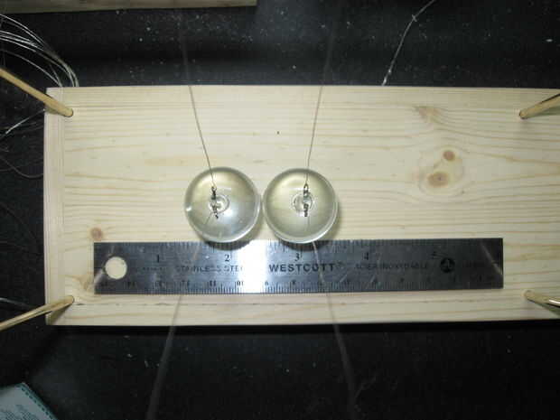 Comenzar por marcar el centro exacto del colgante latón carriles y colgar una bola. Se sujetan los extremos del alambre de suspensión con un enganche de media. Prueba para centro colocando un borde recto en la base y ligeramente mirando hacia abajo desde la parte superior, hacer pivotar la bola para asegurarse de que cambios paralelo a las barras de latón.