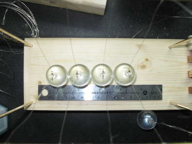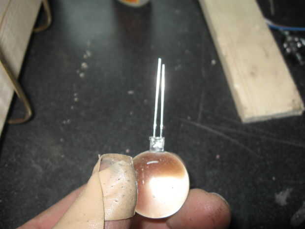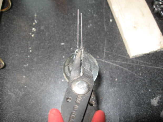 Los cables utilizados son alambre de cobre solo filamento que fue separado del cable trenzado múltiple. Esto puede no ser la mejor opción, pero necesita un ligero flexible de alambre. Un solo filamento de alambre es alimentado a través de los lazos con los LEDs y luego soldado en su lugar que se separa el filamento entre los lazos eliminando cualquier corto circuito.