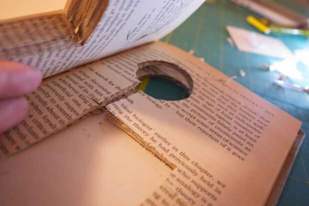 Una vez que el agujero de la botella, cortar un pequeño canal para el cable. Si no tienes un paquete de baterías, sólo corte directamente a través de un borde del libro, de lo contrario cortar hacia la ubicación del paquete de. El canal debe comenzar en el centro de la base del agujero de la botella, dejando suficiente espacio para el cable de ajuste en la parte inferior de la botella cuando su insertado.