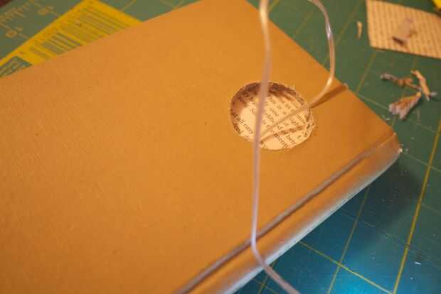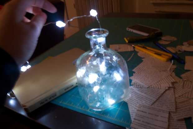 Con el libro Abra la parte inferior del agujero de la botella, coloque la batería en su cavidad (o el cable de fuera el libro del hilo de rosca). Tire de la cadena de luces a través del agujero en la cubierta frontal. Puedes hacer el paquete con un poco de pegamento o cinta.