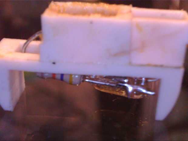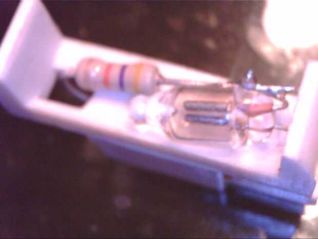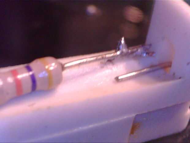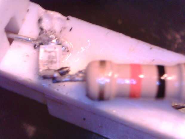 Me gustaría una pata de la resistencia en una manera similar a la forma de que la pierna fue envuelto alrededor del eje de balancín antes que recortar. Ver foto 4 de aclaración porque es demasiado difícil de describir. Entonces recorta la otra pata de la resistencia de muy corto. Entonces soldar al LED. La pierna que fue cortada fue utilizada como el otro pin para el LED y se envuelve con el otro extremo de la oscilante (ver fotos).