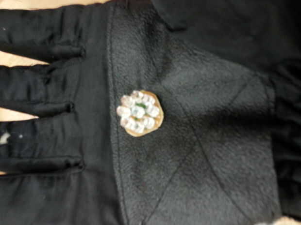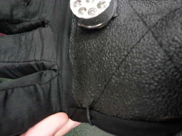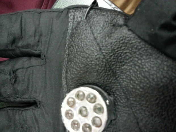 En medio del guante, use el cuchillo X-acto para cortar los agujeros para los cables saliendo del LED en. que el espacio entre los agujeros igual al espacio entre los cables soldados en el LED. Asegúrese de no cortar el interior de su guante, sólo la capa externa. Cortar 2 agujeros en los lados opuestos del guante para que pueda obtener los alambres de la capa pones en. Después de poner los cables por los agujeros de ambos, tire de ellas hasta que el LED quede asegurado firmemente en el centro del guante.
