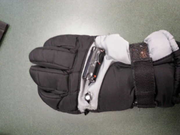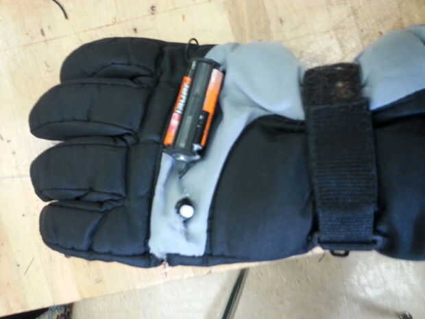 Utilice cinta aisladora para asegurar la batería en el guante. Corte un agujero en la capa externa del guante e inserte el interruptor. Que cosa más apretado en su lugar o simplemente cinta adhesiva hacia abajo.
