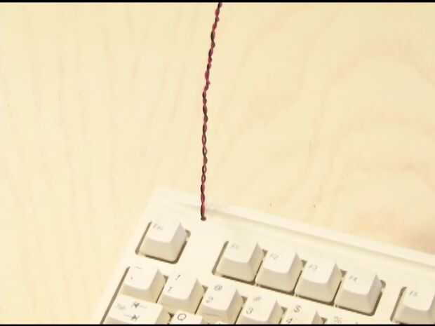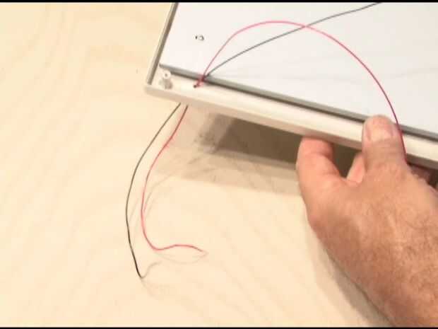 Tras perforar dos agujeros pequeños en la parte superior del teclado, ejecute un cable negro y rojo a través de cada orificio y después de instalar la placa de circuito, hasta cerrar el caso y el tornillo cierra. Ahora tuerza los alambres juntos para darles añade fuerza.
