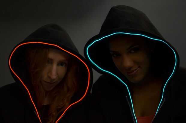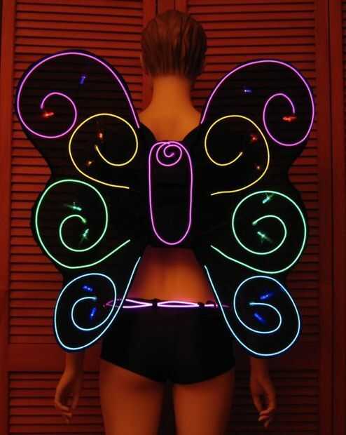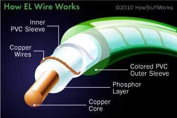 EL alambre es como un palillo del resplandor pero largo y flexible (bastante). No dim, pero puede oscilar (dependiendo de su controlador) y está disponible en muchos colores! Es como un alambre grueso con interior (de interior a exterior): alambre de cobre, capa de fósforo, 2 increíbles pequeños alambres, plástico, capa de color.