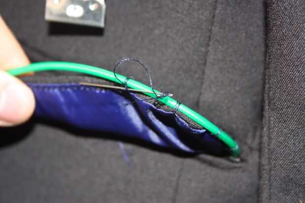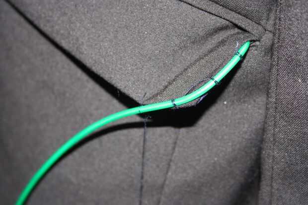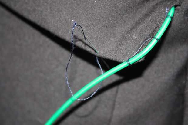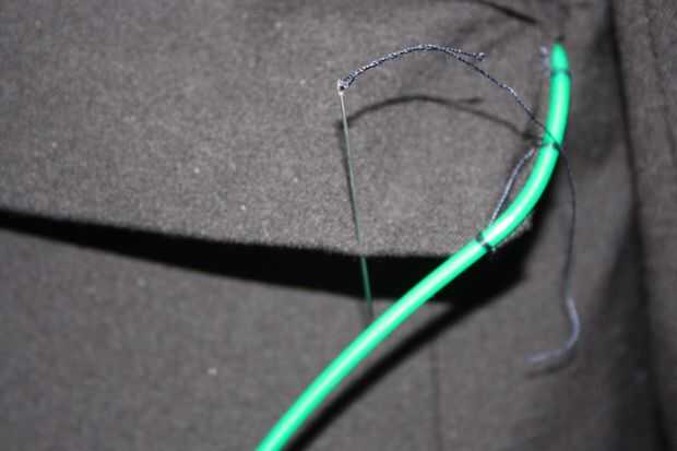 ProTip: también se puede utilizar una máquina de coser. He probado probado este y EL cable va a sobrevivir esto. A la hora de hacer mi chaqueta, tuve la oportunidad de utilizar una máquina de coser, así que lo hice a mano. Sin embargo; Si usted tiene uno puede utilizar uno. Sólo asegúrese de que la aguja oscila bastante a los lados para que no perfore EL alambre.