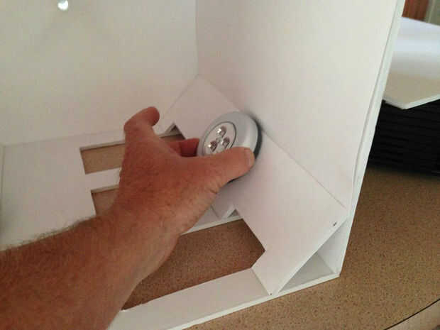 Conecte las luces a estos paneles angulados dentro del gabinete (mina vino con dorso adhesivo). En el centro verticalmente.