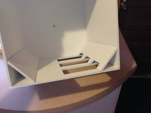 Cortar dos paneles de núcleo de espuma de 4 pulgadas de ancho por 12 pulgadas de alto. Pegue los paneles dentro de las esquinas frontales izquierdos y derecho de los gabinetes en un ángulo de 45 °. Tendrás que "muesca", uno de ellos alrededor de los orificios de la cámara.