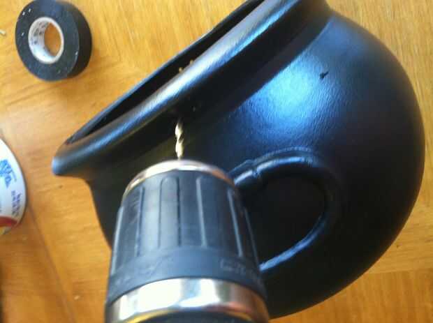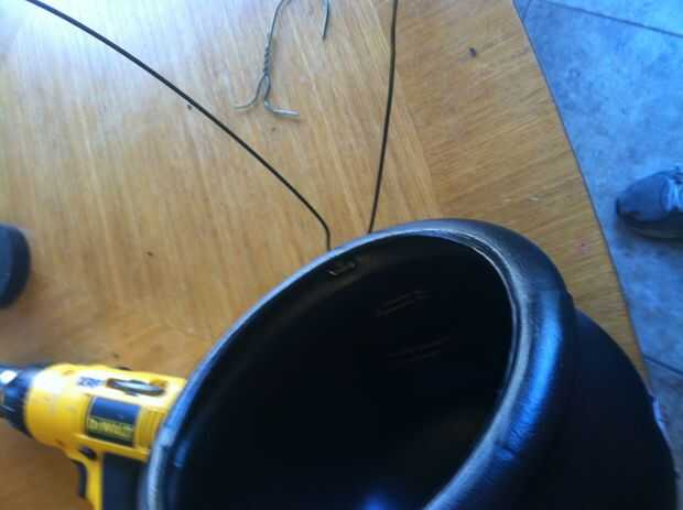 Dos agujeros perforados en cada lado de la caldera para la manija. Les perforé horizontalmente, la próxima vez les taladrará verticalmente, uno encima del otro, para hacer el movimiento de la manija mejor y no se unen.