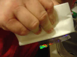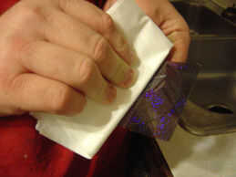 Utilizando la tarjeta de crédito envuelta en servilletas, la escobilla de goma agua hacia fuera debajo del tinte trabajando desde el centro hacia el exterior y fuera de la tonalidad. Recuerde que el propósito del tinte no es la joya de color tanto como ocultar el interior de tu XBOX cuando las luces en su interior mineral apagado así que no utiliza nada oscuro. Una vez que la joya es teñida, conjunto aparte, no necesitamos de un tiempo y esto le dará oportunidad de secar.