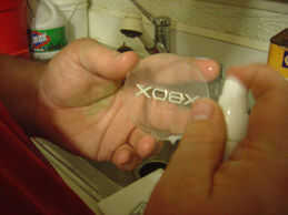 Una vez que se pule a satisfacción, cortar una pieza de entintado de aproximadamente una pulgada más grande que la joya en sí mismo. Aplicar el agua jabonosa a la parte plana de la joya (su parte inferior). Se puede utilizar demasiada agua para poner tanto como usted desea.