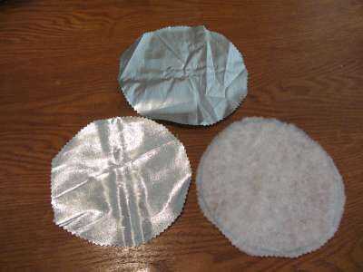 Cortar el primer círculo de la tela con un diámetro de 5 pulgadas. Los dos círculos, uno de tela y otro de bateo con un diámetro de 4 pulgadas.