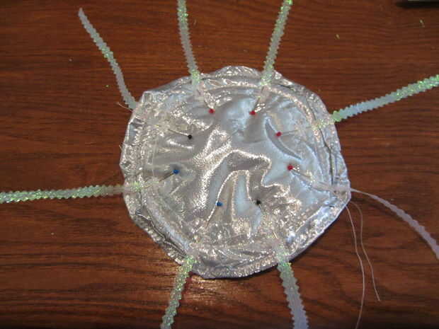 Ahora hay una cosa más a pin. Tomar ocho pedazos de cinta y colocarlos igualmente a lo largo de los bordes de la medusa. Prender los tentáculos de la cinta en su lugar sin dar la vuelta los círculos.