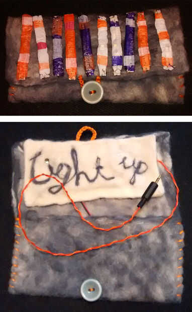 -Una bolsa de embrague con granos de perno prisionero de prensa LED. Usé hilo conductor para coser los botones automáticos uno al otro creando un circuito continuo.