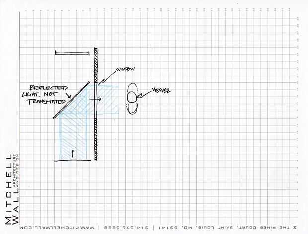 En el segundo dibujo ver cómo Plexiglás ahora está siendo utilizado como un espejo. La luz de la superficie de proyección se refleja en el plexiglás, no transmite a través de como lo ha sido hasta ahora. Esta es la razón por la cual el espectador puede ver. Es el mismo principio que, en un día soleado puede mirar y ver el mundo, pero el sol es un poco más difícil de mirar. Es la diferencia entre mirar la fuente de la luz o en la reflexión.