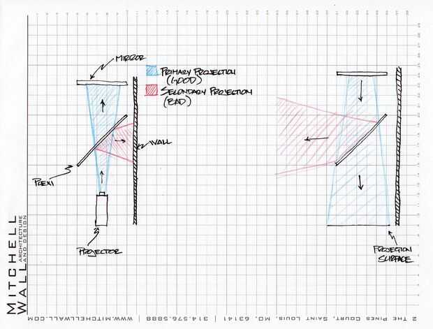 La primera imagen de arriba muestra la ruta de que la luz viaja desde el proyector a la superficie de proyección. Estas son dos de los tres pasos que recorre la imagen con el fin de lograr la ilusión. La luz deja el proyector y como deja, debido a la lente, se expande en todas direcciones. En primer lugar, la luz entra en contacto con el plexiglás. Como resultado de este contacto, se refleja algo de luz. Esto es inevitable. Es también por qué ves una versión pequeña de la novia proyecta debajo de la ventana de la imagen en el post original. Esto es un artefacto y no es bueno. Si esta brilla en el campo de visión de los espectadores, crea puntos brillantes y muy bonita ruinas el efecto. La luz que se refleja no continúa a través del plexiglás y golpea el espejo. Ahora recuerdo, la imagen aún está en expansión. La luz entonces rebota en el espejo y se dirige a otra vez el plexiglás (lado derecho del dibujo). Lo mismo sucede aquí, como sucedió antes, pero ahora, el artefacto está siendo proyectado hacia atrás. Esto fue por qué tuve que colgar el paño negro. Para evitar que a una novia de 12 pies de altura siendo visible en la parte posterior de la escena. Una vez más, la luz no reflejada viaja a través de la plexi y golpea la superficie de proyección detrás. Una vez que la luz golpea una superficie opaca, es hecho ampliando y esto es la imagen final que va a utilizar.