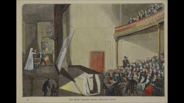 Este sistema de pantalla utiliza una técnica que se refiere a menudo como fantasma de la pimienta. Fue inventado primero por Giambattista della Porta en 1584 y se ha utilizado comúnmente en el teatro. Algunos de sus usos famosos incluyen rendimiento