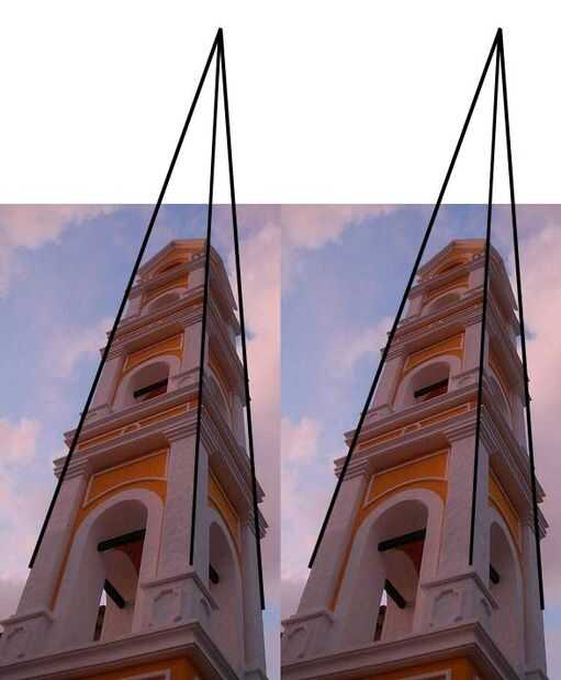 Artículos paralelos tienen el mismo punto de fuga. Así que las líneas verticales de estos dos edificios convergerían en el mismo punto si fueran normales. puesto que aquí son muy divergentes, estamos engañados pensando que el edificio a la derecha se inclina lejos al lado.