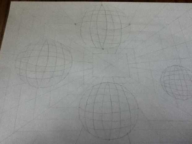 Dibujar líneas horizontales y verticales a través del círculo, curva que se curva a lo largo de la superficie de una esfera. Las dos líneas más medias deben reunirse en el borde del círculo. Puede usar puntos como una línea de guía.