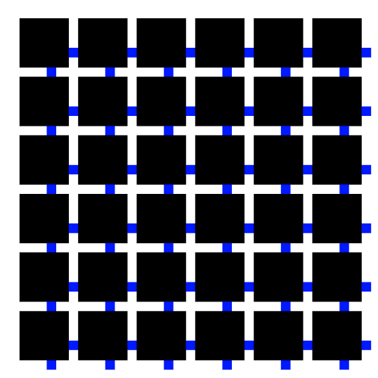 esta ilusión óptica es una variante de la anterior ilusión óptica con los fantasmas grises que aparecen en las intersecciones de la rejilla negra.Todavía tenemos una rejilla negro aquí, pero ahora las líneas son grises y hay círculos blancos en las i