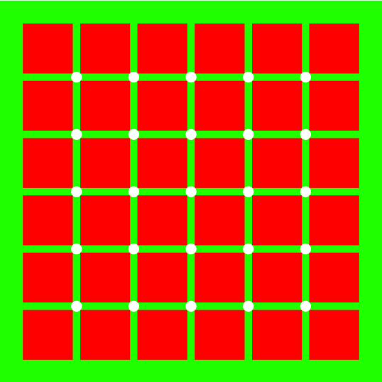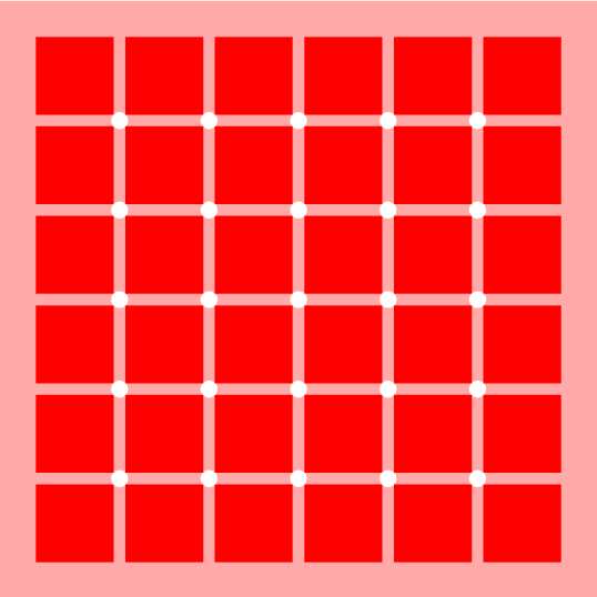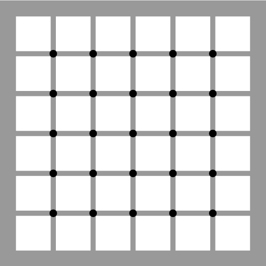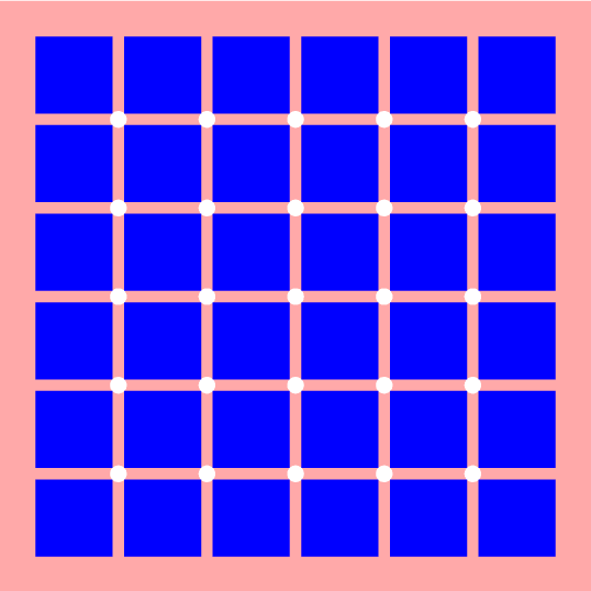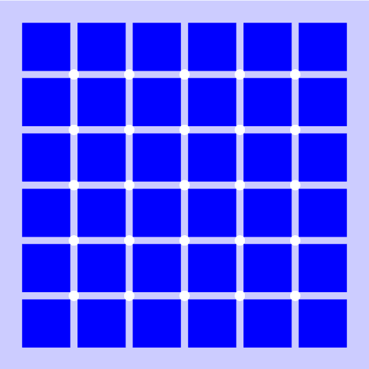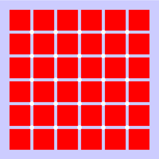 en esta ilusión óptica ves puntos grises en las intersecciones de la cuadrícula de abajo. Esto se conoce como la ilusión de la cuadrícula de Hermann. Los puntos grises no están realmente allí. Usted puede hacerlos desaparecer mirando directamente en