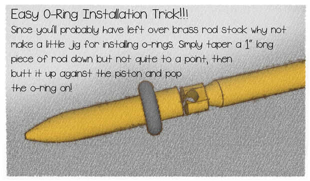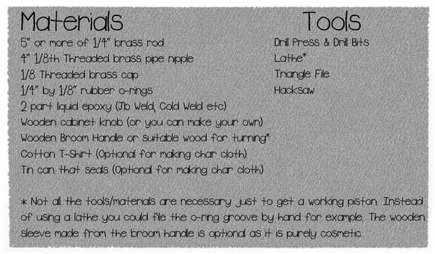 * No todas los herramientas y materiales son necesarios para conseguir un pistón de trabajo. En lugar de utilizar un torno usted podría presentar la ranura del aro tórico a mano por ejemplo. El manguito de madera de la manija de la escoba es opcional como su puramente cosmético.