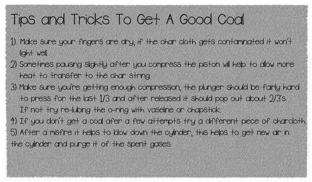 Un pistón de fuego es una herramienta poco impresionante que ha existido durante cientos de años, lamentablemente gracias a la invención del común coincida con su popularidad disminuyó y casi desapareció. Es un pistón y un cilindro que funciona como un motor diesel que utilizan la compresión para producir un pedazo de Yesca para calentar rápidamente y convertirse en un carbón. Wikipedia lo explica mejor que yo así que si usted está realmente interesado sólo click aquí para la historia completa.