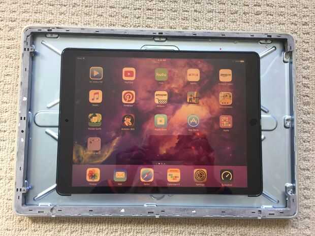 Montaje de la iPad Pro en lugar hizo fácil media pulgada amplia goma burletes y cintas gorila. Me cubre toda la parte posterior del marco con una capa de cinta gorila llenado en todas las áreas alrededor de la iPad con el burlete de goma y luego aplica una capa de cinta gorila en la parte superior de los burletes. Luego en cada una de las esquinas superiores, la media superior y la mitad de los lados y la parte inferior coloqué pequeños las tiras de Velcro industrial. Esto se puede encontrar en la ferretería. Viene en tiras de 3 pulgadas de largo por una pulgada de ancho. Puse el lado del gancho de plástico duro en el Monte y luego aplica el lado suave loop para el caso del iPad.