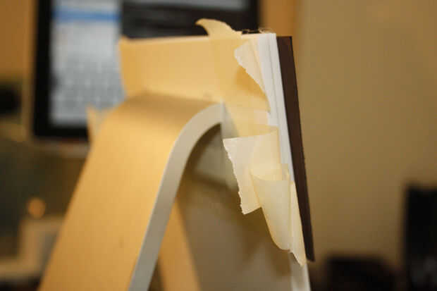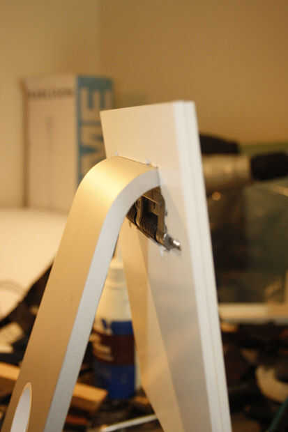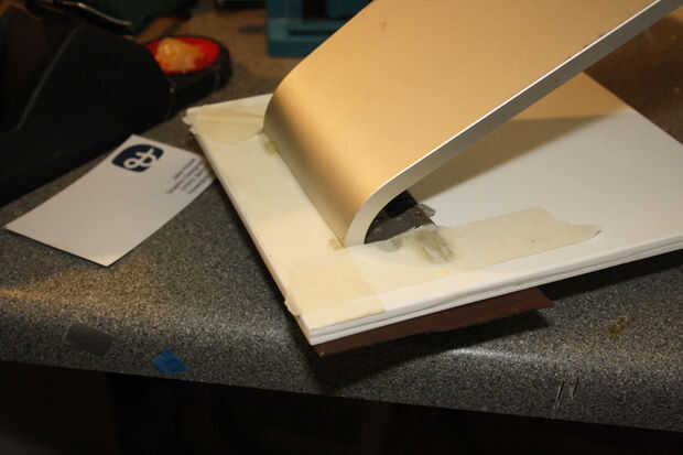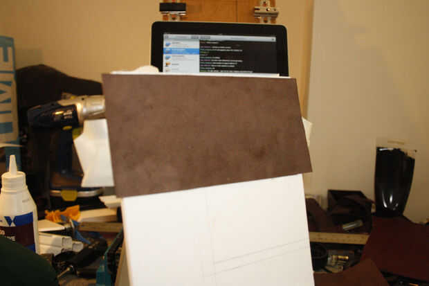 El estireno sobre el soporte, mina era un ajuste agradable, por lo que he podido posicionar el pie justo antes de pegar. En la parte delantera he decidido pegamento en una sección agradable de cuero para evitar que el soporte de rayar la parte trasera del iPad.