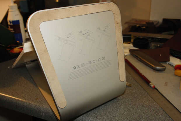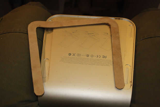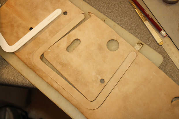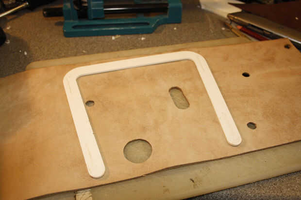 - Lugar el plástico eliminado en una de las secciones de cuero bastante grueso (unos 4mm), usando un cuchillo cuidadosamente traza alrededor del plástico, intentar mantenga una mano sobre el plástico en todo momento, por lo que no se mueva.