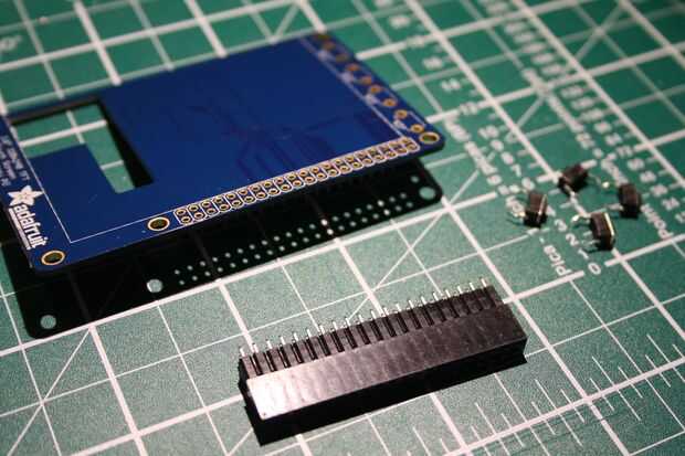 En primer lugar de la soldadura en la cabecera de la GPIO e Interruptores táctiles PCB de LCD. He quitado la pantalla para facilitar un poco las cosas.