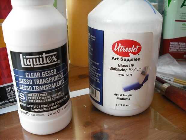 -medio acrílico o gesso (modge podge probablemente demasiado? solo necesita no ser agua soluble y bastante adhesivo)
