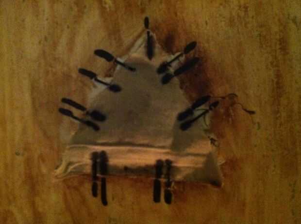 Ahora es el momento para la cara deja comienzo con la nariz. Recuerde que el par de shorts de jean cortar el bolsillo y cortar en un triángulo. Yo relleno con algunas cosas para esa de la mirada 3d y grapar la parte superior y cada lado 1 vez.
