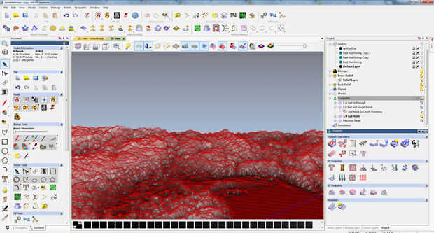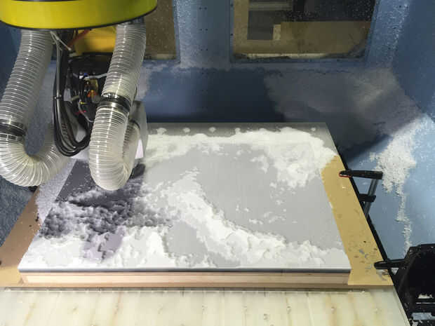 ArtCAM es un muy práctico software para este proyecto. Al instante se convertirá la imagen en un alivio y tiene un flujo de trabajo bastante sencillo para generar operaciones de CAM. Para crear el relieve, simplemente abre la imagen en ArtCAM y elegir sus dimensiones. Para las operaciones de mecanizado, primero probé una 1" fresa de desbaste. Sin embargo, con esta fresa, en algunos lugares las capas de resina se separaron. Terrorífico! Pensé que podría perder el bloque conjunto gigante de resina. Esto era porque al verter dos de las capas, he dejado la cura de la resina durante demasiado tiempo. Por suerte, encontré que desbastar con un molino de bola de 1"(con un muy conservador paso descendente/ancho de paso) impidió que la separación ocurra. Después el desbaste inicial, hice una primera pasada de acabado con un molino de bolas de 5/8" a. 15" ancho de paso, dejando un. 04" prestación por detrás. Luego hice dos pasadas de acabado, con 1/4" y 1/8" molinos de bola, a. 06" anchos. Estos dos pases tomaron alrededor de 11 horas y 16 horas de mecanizado respectivamente. El total de tiempo de mecanizado fue alrededor de 36 horas. Ver resina tan cara volar!
