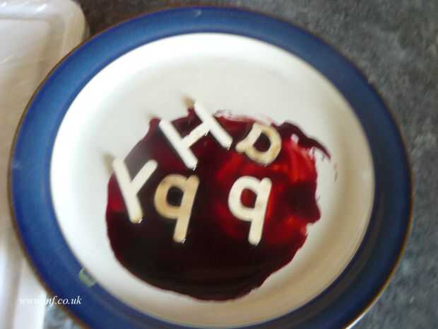 Para teñir las letras ponemos poco colorante en un recipiente de comida. Con las cartas boca abajo pasamos les en el colorante hasta que la superficie estaba cubierta. Luego ponerlas a secar sobre una tabla para picar cubierta con film transparente. Es importante tener en cuenta que alimento colorante es bueno en la coloración de muchas otras cosas además de madera y comida así que ten cuidado donde secar sus cartas!