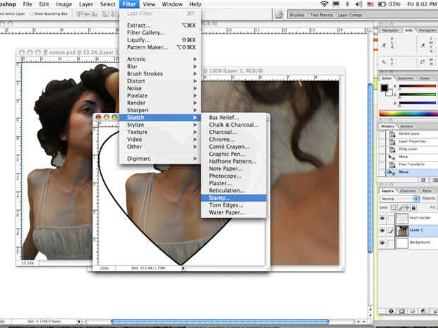 Si aún no ha hecho así, reordenar la capa para que quede detrás de la capa "borde del corazón." También, puede que necesite cambiar el tamaño de la capa (Edición--> Transformar--> escala). Ahora, utilizando la herramienta mover, mover alrededor de su imagen posterizado hasta encontrar a la estructura de la derecha.