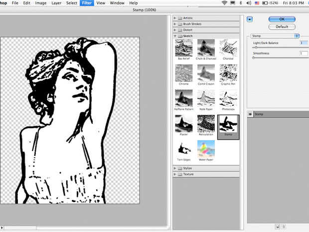 Una vez que la imagen se pega en la plantilla que vas a quererlo de posterización. La mejor manera de hacer esto en Photoshop es para asegurarse de que el color frontal es negro y su color de fondo es blanco y luego aplicar el filtro "sello" a él (filtro--> dibujo--> sello).